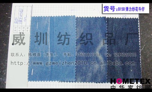 織物組織:平紋 幅寬:150cm 品名:滌棉牛仔 密度:64*47 水洗工藝:砂洗 貨號:B150彈力炒花牛仔 重量:* 具體用途:褲裝、時裝 別名:B150彈力炒花牛仔 印染工藝:印花 成分及含量:65%棉,30%滌,5%氨綸 主要用途:服裝用布 ============================================================= 以上產品全部現貨供應,可隨時提供樣布卡和現貨,隨時發貨。所有產品全部是廠家直銷價,我們承諾:以超低利潤營銷,我們只求銷售量。為保證您的利益,我司建議您在采購前先確認我們的品質樣與顏色樣后再拿大貨,期待與您的真誠合作。因產品種類較多,具體參考未盡詳盡,如有需要,請您與我們聯系。 瑞豐紡織(中大旗艦店)坐落于國內最大的紡織面料產業中心—廣州中大,是一家專業銷售面料的廠家直銷商。主要經營產品有:全棉凈色、仿記憶絲面料、全棉(TC)色織等,面料品種花達上千余種,所有產品全部現貨經營。 我們面料的品質來源于:1、采用國內外優質的原材料;2、使用精良的生產工藝和設備;3、完善的生產質量管理體系。我們具有開發和創新品種的強烈意識和優越條件,并根據客戶需求與市場變化時時推出潮流面料。憑著多年的專業行業經驗,根據客戶需求,不論客戶在全國任何地方,只要提供小樣,就可在一兩天時間內輕松獲得所需面料的信息。 批發說明供應商支持混批 。 ============================================================= 有意請加QQ:1295021910或電話聯系。 公司名稱:威圳紡織品廠 聯系人:陳修喜先生 手機:13650817858 網址:http://www.gzweizhen2010.cn.alibaba.com =============================================================