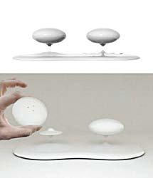 這其實是一只磁懸浮調料瓶,它的整體被設計成白色,共有三個部分:調料瓶、底座與基座。兩個橢圓形的調料瓶被安放在磁體支撐的小巧底座上,而這兩個小巧的底座通過與基座之間的磁力作用懸浮在空中從而起到對調料瓶的支撐作用。