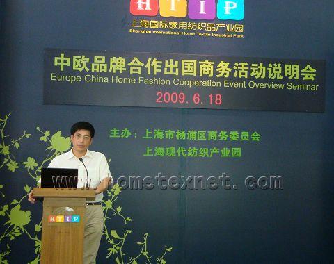 6月18日,“2009中歐品牌合作商務(wù)活動”在家紡園隆重召開。來自向比利時(shí)、荷蘭、法國、意大利、德國和西班牙各使館、商會以及50余家企業(yè)家代表匯集參加了說明會。作為主辦單位的上海市楊浦區(qū)商務(wù)委員會經(jīng)琪主任,上海現(xiàn)代紡織產(chǎn)業(yè)園總經(jīng)理周根生親自對此次活動的開幕致辭!